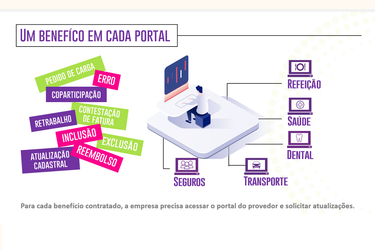 Para cada benefício contratado, a empresa precisa acessar o portal do provedor e manualmente solicitar cada movimentação necessária como: inclusão, exclusão, atualização cadastral, pedido de carga, reembolso, contestar fatura, coparticipação, entre outros.